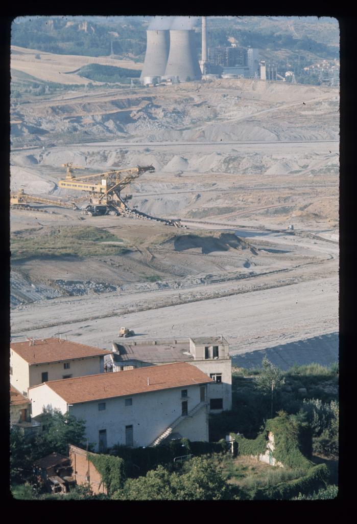 Castelnuovo dei Sabbioni Scoperchiamento del banco di lignite con Betta al lavoro. In primo piano si vedono il cinema all'aperto, poi il locale della sala cinematografica e il circolo del paese.;